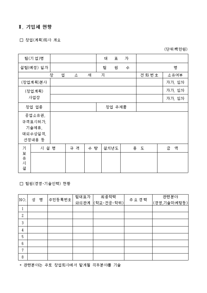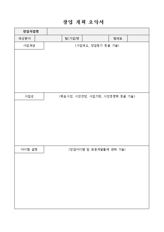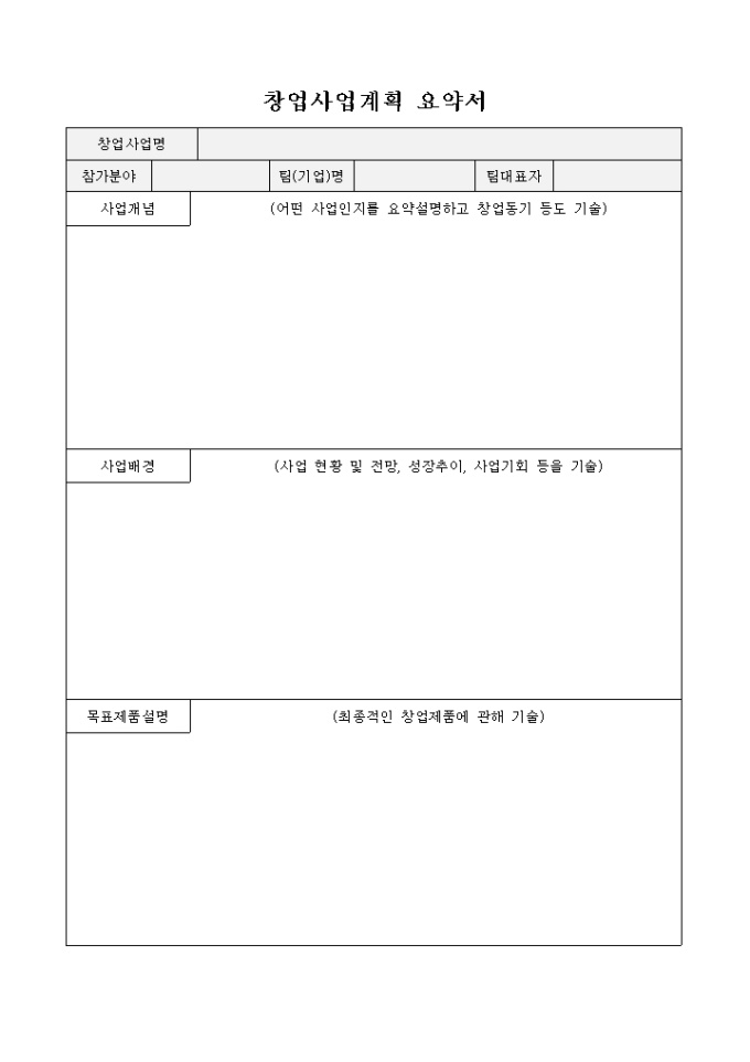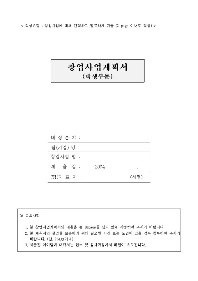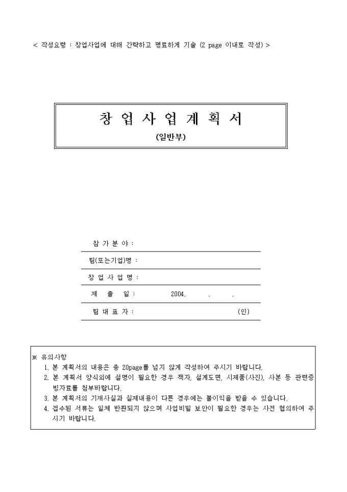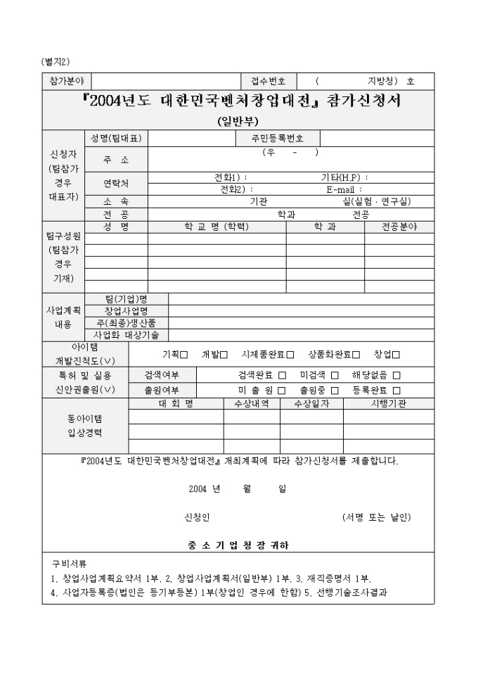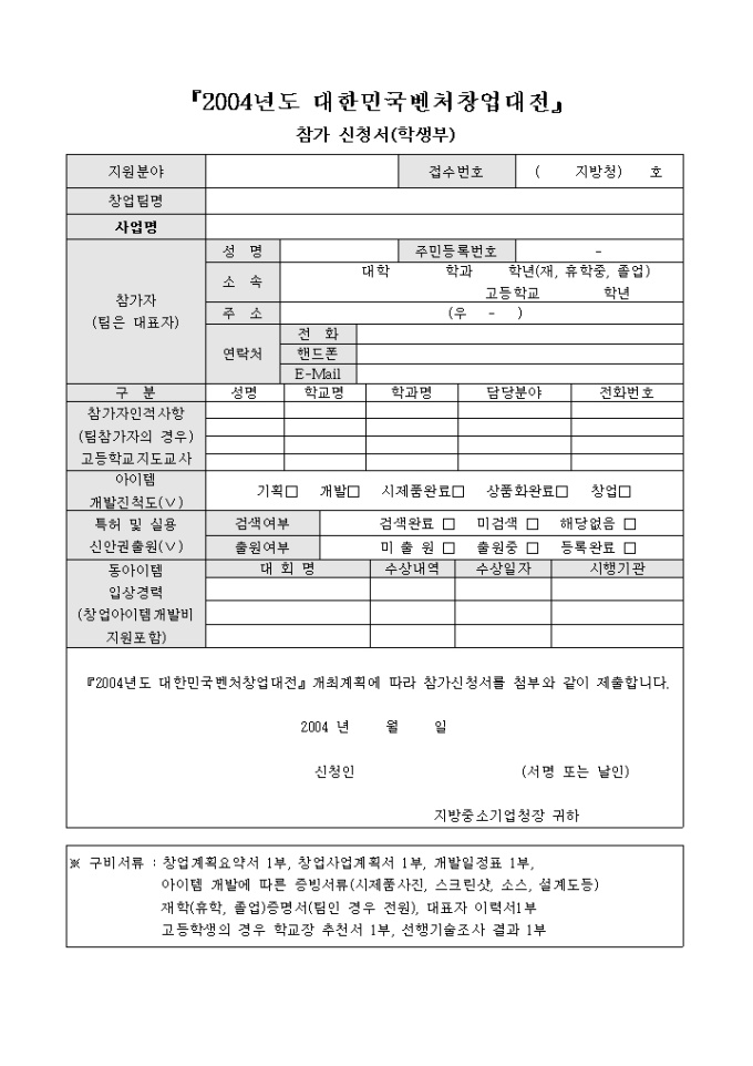 2004년도 대한민국 벤처창업대전 개최계획에 따라 참가신청시 사용하는 양식입니다.창업계획요약서, 창업사업계획서도 첨부되어 있습니다.