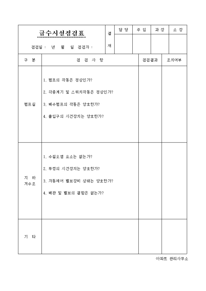 9,000원/월펌프실, 지하저수조의 급수시설 점검사항에 대한 결과를 적고 그에 대한 조치내역을 기록하는 양식입니다.