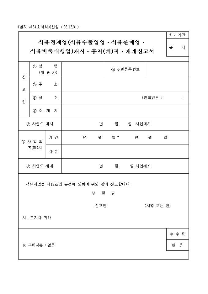 9,000원/월석유사업법 제12조의 규정에 의하여 위와 같이 신고하고자 할 때 사용하는 "석유 정제업(석유 수출입업, 석유 판매업, 석유 비축대행업)개시, 휴지(폐)지, 재개신고서" 양식입니다.