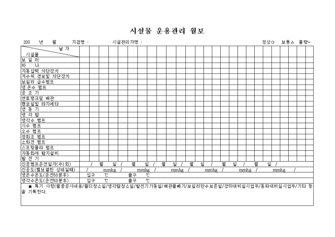 보일러, 바나, 자동압력 차단자치부터, 진공도, 냉온수온도와 냉각수 온도등의 항목에 대한 관리내역을 기재한느 시설물 운용관리 월보양식입니다