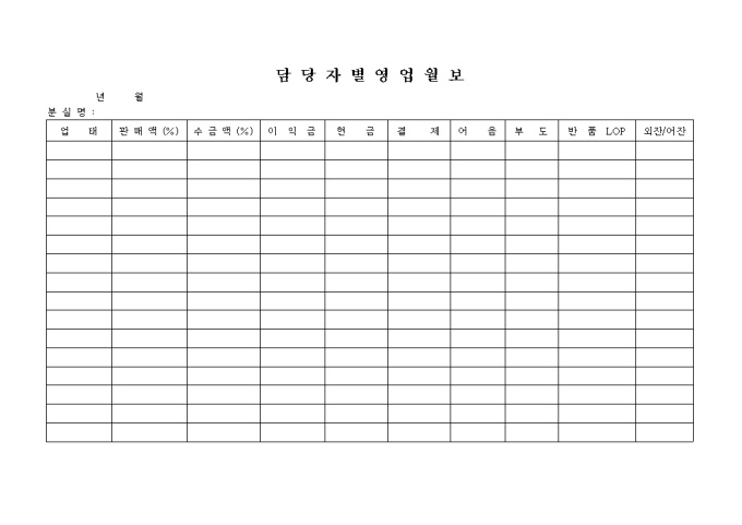 9,000원/월영업 담당자별 판매액, 수금액, 이익금등의 내역을 기록하는 영업월보 양식입니다.