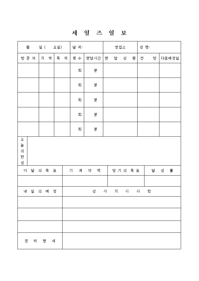 9,000원/월일일 방문처별 면담내용과 전망, 다음예정일등을 기록하여 관리하는 양식입니다. 오늘의 반성내용과 이달의 목표, 계약에 관한 내용을 기록하는 양식입니다.