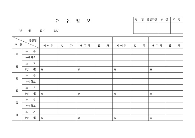 9,000원/월메이커별 제품 수주와 수주취소등의 내역을 이월, 당일, 합계등으로 표기할 때 사용하는 양식입니다.