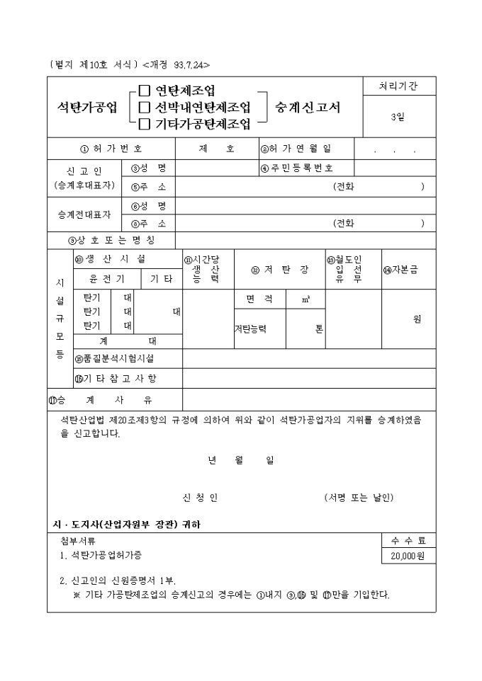 9,000원/월석탄산업법 제20조제3항의 규정에 의하여 위와 같이 석탄가공업자의 지위를 승계하였음을 신고하고자 할 때 사용하는 '석탄가공업(연탄 제조업, 선박내 연탄제조업, 기타가공탄 제조업) 승계신고서' 양식입니다.