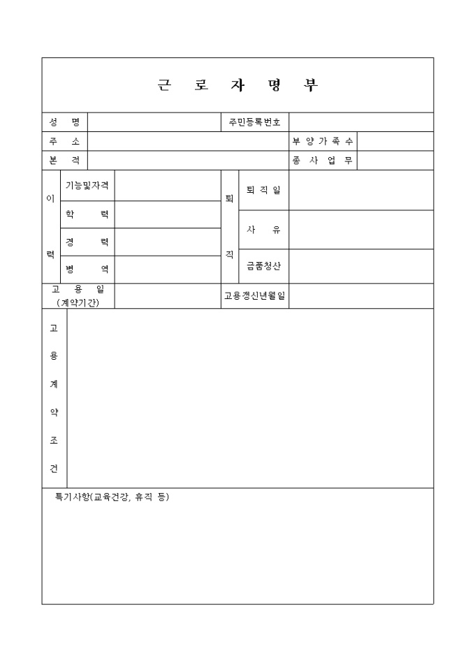 9,000원/월근로자에 대한 기본 인적사항 및 이·퇴직사항, 고용일, 고용갱신년월일, 고용계약조건을 기록하는 근로자명부 양식입니다.