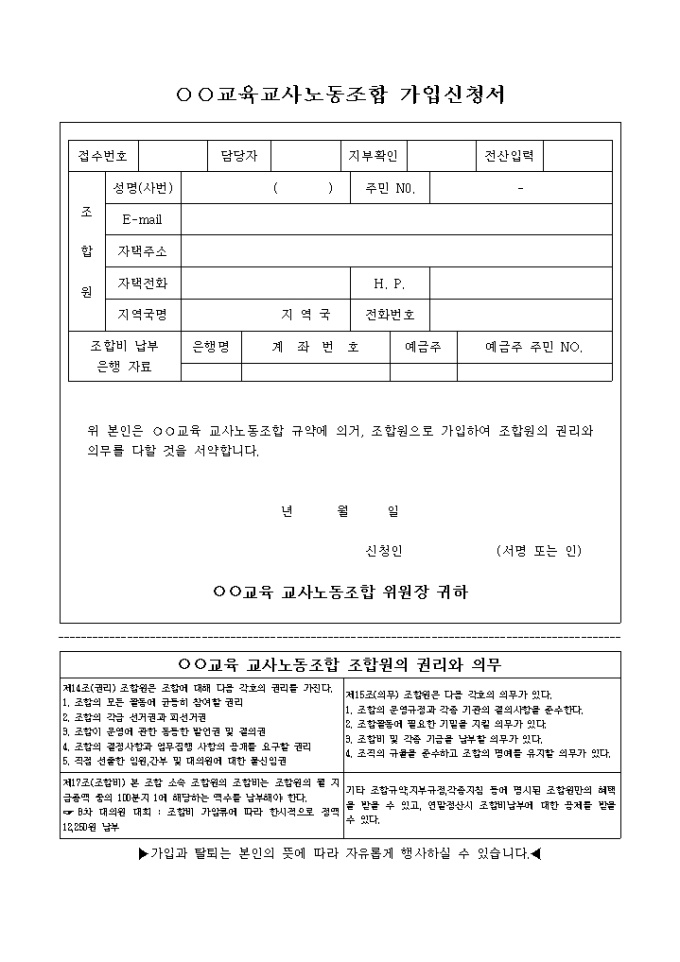 9,000원/월교사노동조합 규약에 의거, 조합원으로 가입하여 조합원의 권리와 의무를 다할 것을 서약하며 노동조합 가입시 사용하는 신청서 양식입니다.