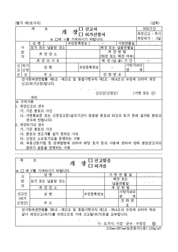 9,000원/월장사등에관한법률 제8조․제23조 및 동법시행규칙 제2조․제14조의 규정에 의하여 개장신고(허가신청)하는 양식입니다.