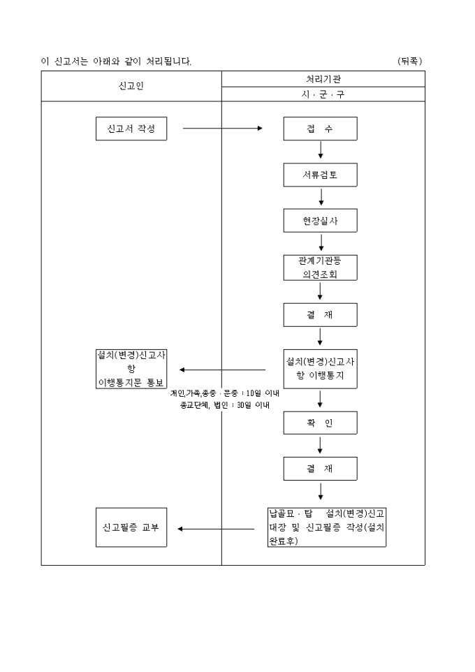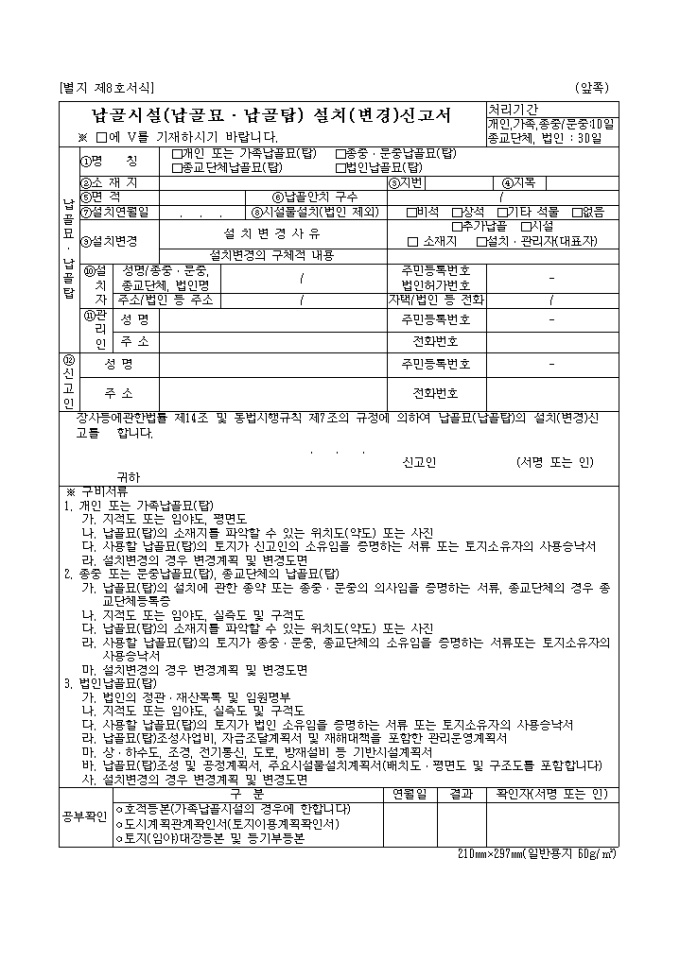 9,000원/월장사등에 관한 법률 제14조 및 동법시행규칙 제7조의 규정에 의하여 납골묘(납골탑)의 설치(변경)신고하는 납골시설(납골묘·납골탑) 설치(변경)신고서 양식입니다.
