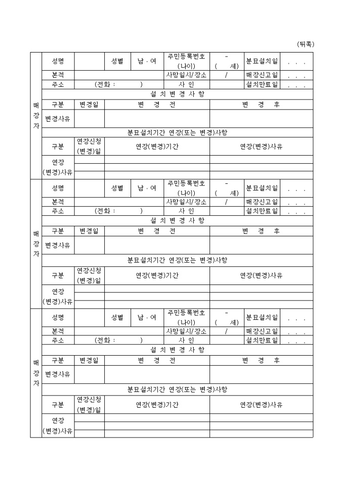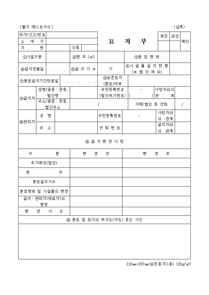 9,000원/월분묘에 대한 소재지 및 설치자, 관리자 인적사항 등을 기입하고 설치변경사항을 기록하는 묘적부 양식입니다.