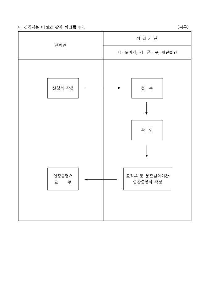 장사등에관한법률 제17조 및 동법시행규칙 제11조의 규정에 의하여 분묘설치기간의 연장을 신청하는 분묘설치기간 연장신청서 양식입니다.