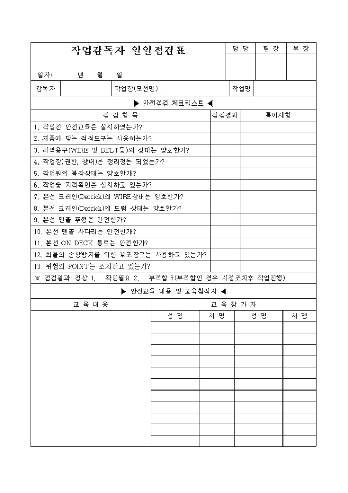 9,000원/월작업감독자가 13개의 항목에 대해 안전점검 체크를 하도록 되어 있는 양식입니다.안전교육내용 및 교육참석자내역도 기재합니다.