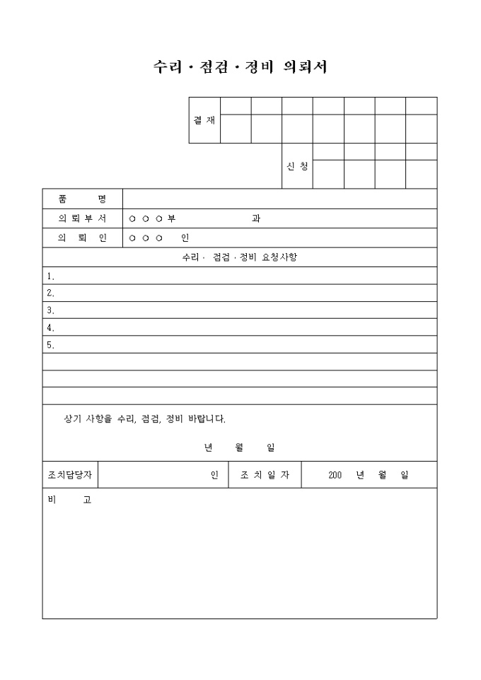 제품에 대해 , 수리, 점검, 정비를 담당자에게 신청할 때 사용하는 양식입니다.