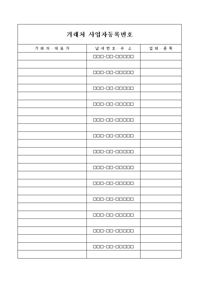 9,000원/월거래처별, 대표자, 사업자등록번호, 주소, 업태종목등을 기재하여 관리하는 양식입니다.