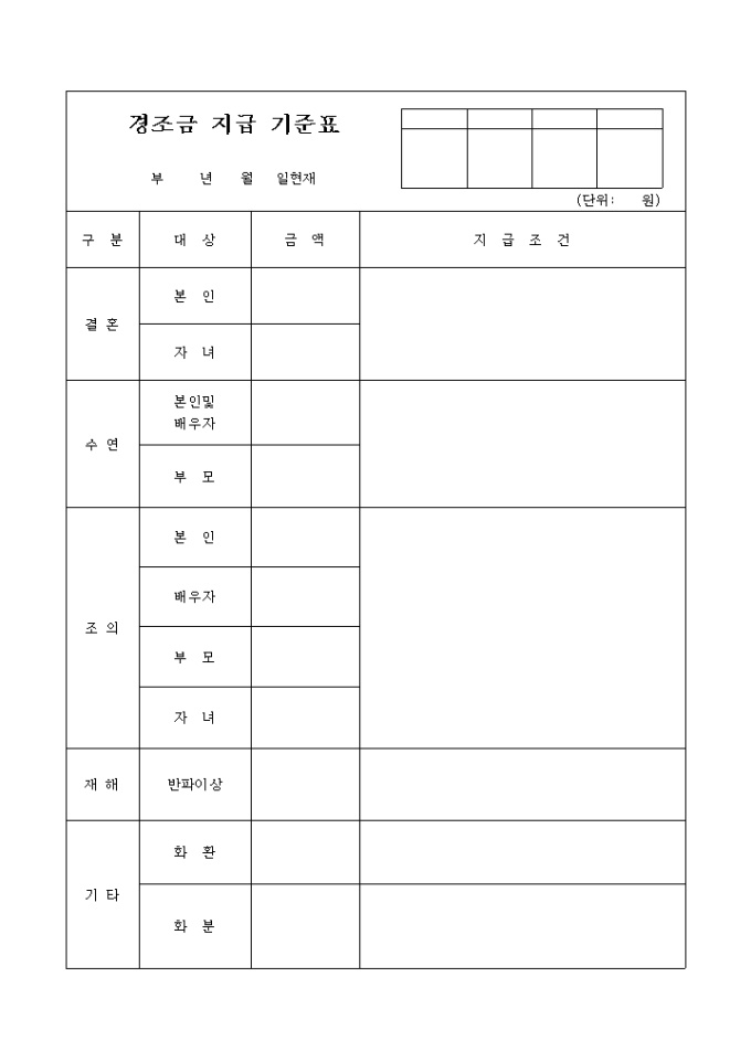 경조사별 경조금 지급 기준을 기록하는 양식입니다.