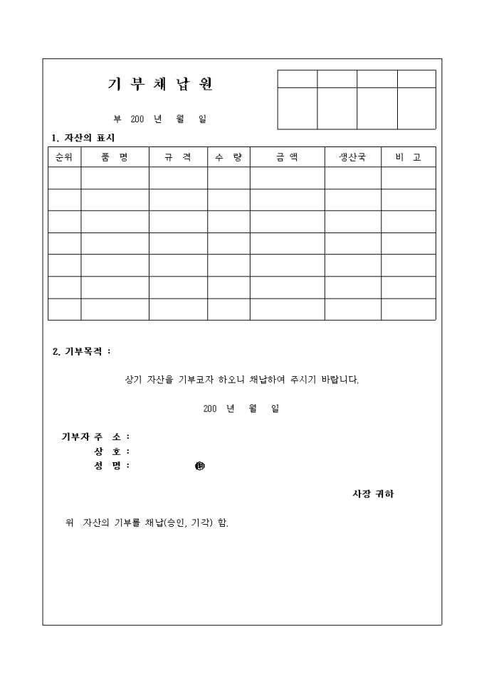9,000원/월자산을 기부코자 할 때 채납을 요청하는 양식입니다.