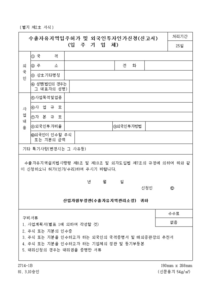 수출자유지역설치법시행령 제8조 및 제10조 및 외자도입법 제7조의 규정에 의하여 위와 같이 신청하오니 허가(인가/수리)를 얻고자 할 때 사용하는 "수출 자유지역 입주 허가 및 외국인 투자인가 신청(신고서)(입주기업체)" 양식입니다.