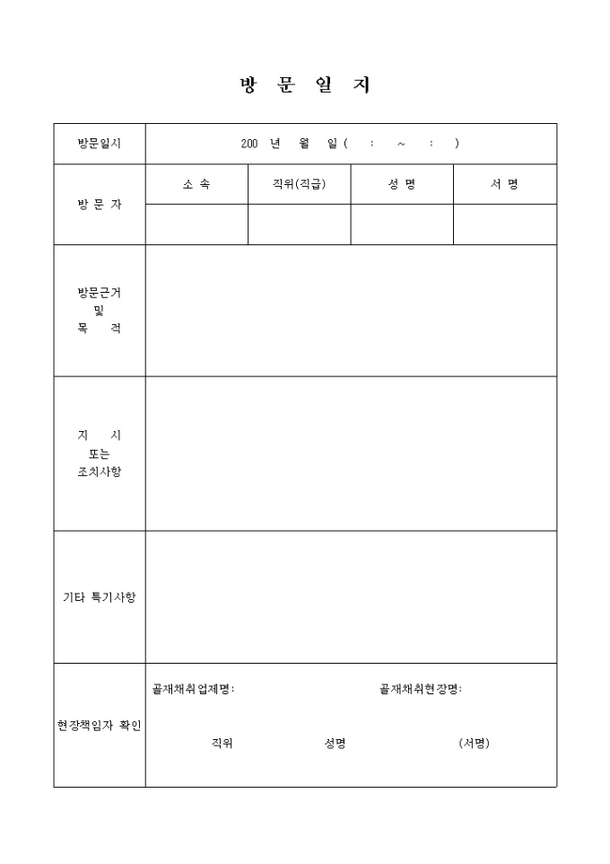 9,000원/월방문근거 및 목적, 지시 또는 조치사항등을 기재하는 방문일지 양식입니다. (골재채취업체관련)