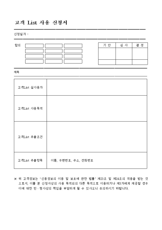 9,000원/월고객리스트 실사용자,사용목적,추출조건,추출항목을 기록하는 고객List 사용신청서입니다.