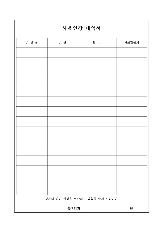 인장의 사용내역에 관한 양식입니다. 인장명, 인영, 용도, 관리책임자등을 기재하도록 되어 있습니다