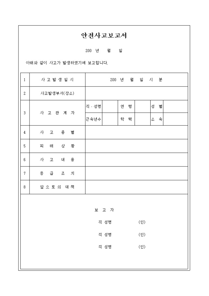 사고발생시 발생일시, 부서, 관계자, 피해상황, 내용, 응급조치, 대책등에 관해 기재하는 양식입니다.