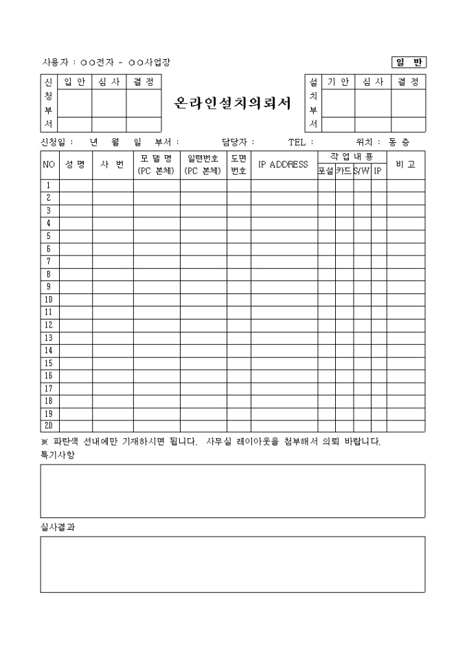 성명, 사번, 모델명, 일련번호, 도면, ip address, 작업내용으로 구성된 오란인 설치의뢰서 양식입니다.
