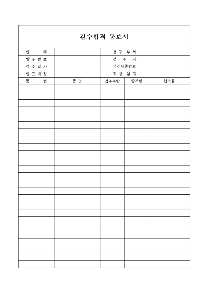 9,000원/월업체명,청구부서,발주번호,검수자,검수일자,샌산제품번호,입고계정,작성일자,품번,품명,검수수량,합격량,합격률을 기록하는 검수합격 통보서입니다.