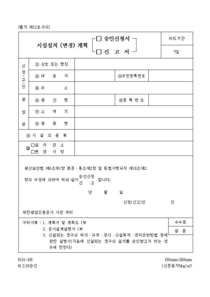 항의 규정에 의하여 위와같이 (승인신청, 신고) 할 때 사용하는 "시설설치(변경) 계획 (승인신청서,신고서)" 양식입니다.
