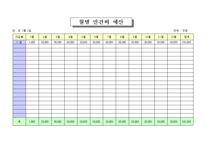 9,000원/월월별 직급별 인건비를 기록하는 월별 인건비 예산서입니다.