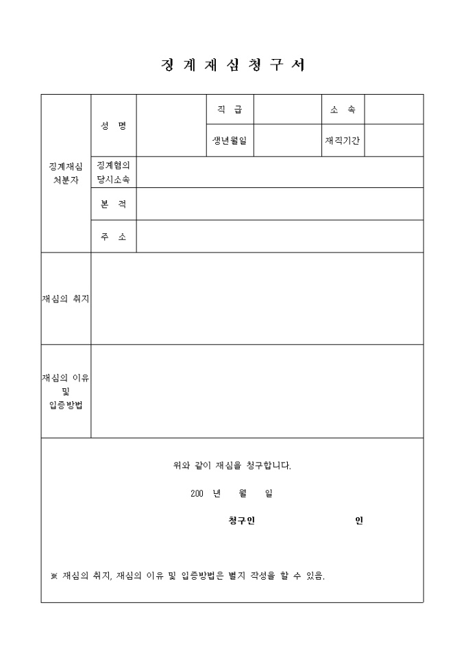 징계에 대해 재심을 청구할 때 사용하는 양식입니다.재심의 취지, 재심의 이유 및 입증방법은 별지 작성을 할 수 있습니다.