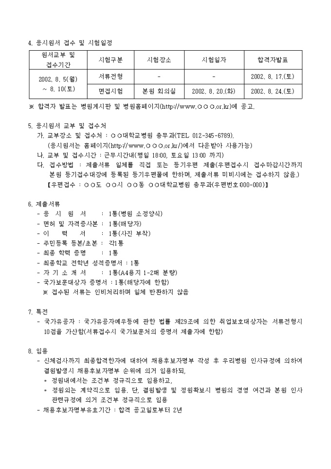 9,000원/월채용분야 및 인원, 전형방법, 응시지원 자격기준, 응시원서 접수 및 시험일정, 응시원서 교부 및 접수처, 제출서류를 기록하는 채용공고문입니다.