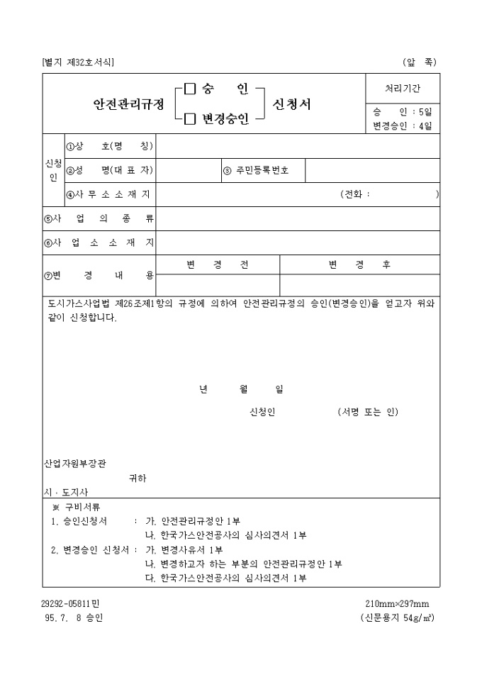 9,000원/월도시가스사업법 제26조제1항의 규정에 의하여 안전관리규정의 승인(변경승인)을 얻고자 위와 같이 신청하고자 할 때 사용하는 "안전관리규정 (승인,변경승인)신청서" 양식입니다.