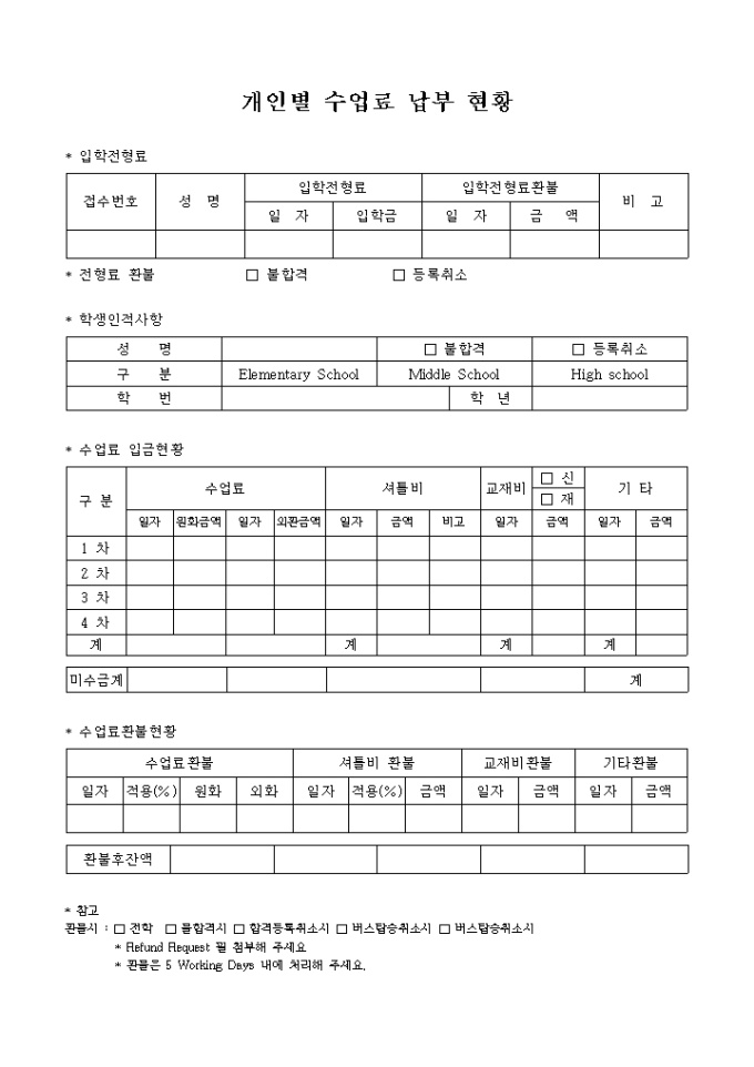 개인별로 수업료 납부내역에 관한 상황을 기록하는 양식입니다.