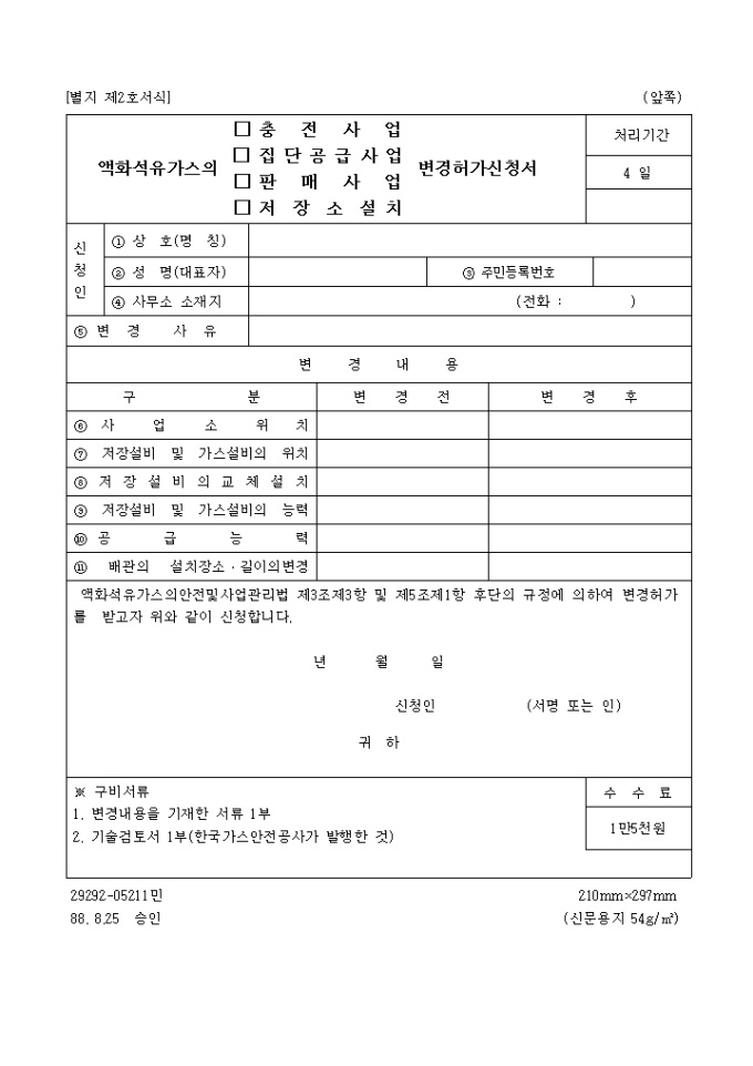 9,000원/월액화석유가스의안전및사업관리법 제3조제3항 및 제5조제1항 후단의 규정에 의하여 변경허가를 받고자 위와 같이 신청하고자 할 때 사용하는 "액화석유 가스의(충전사업,집단 공급사업, 판매 사업, 저장소 설치)변경 허가신청서" 양식입니다.