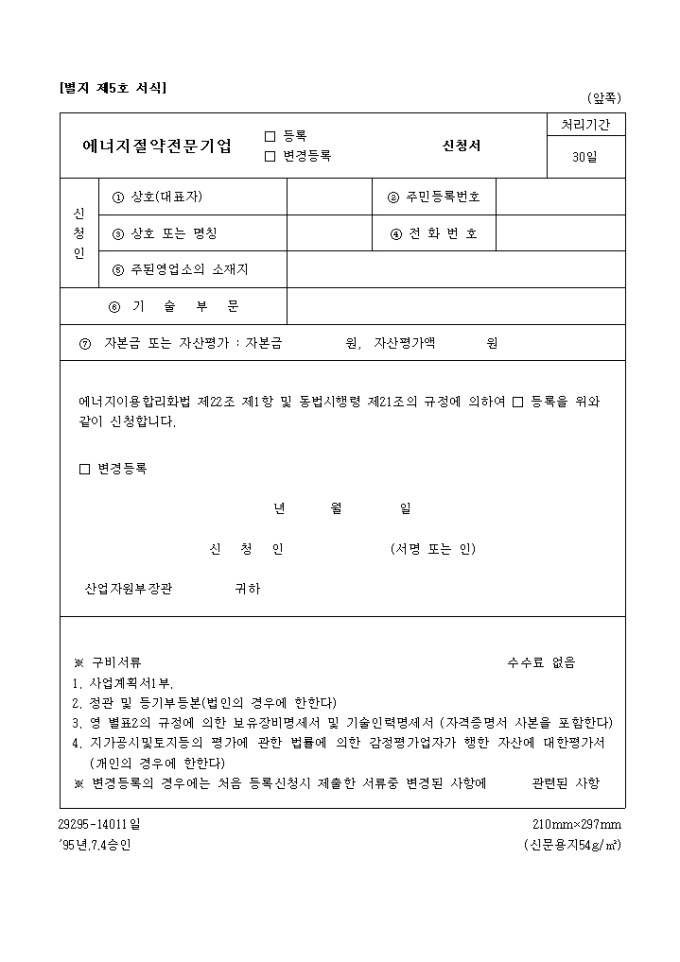 9,000원/월에너지이용합리화법 제22조 제1항 및 동법시행령 제21조의 규정에 의하여 □ 등록을 위와 같이 신청하고자 할 때 사용하는 "에너지 절약 전문기업 (등록,변경등록)신청서" 양식입니다.
