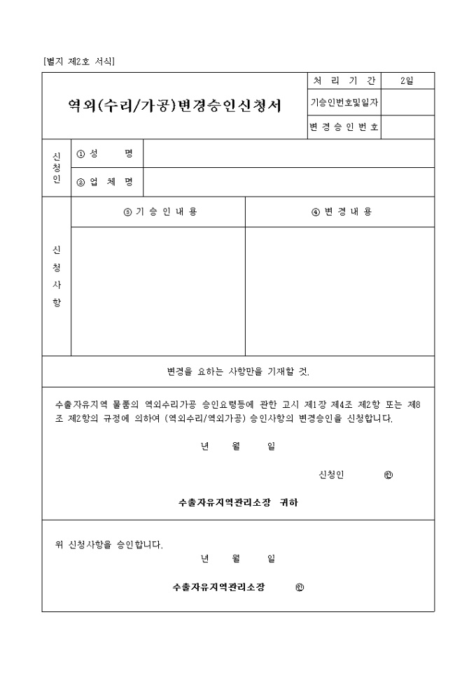 9,000원/월수출자유지역 물품의 역외수리가공 승인요령등에 관한 고시 제1장 제4조 제2항 또는 제8조 제2항의 규정에 의하여 (역외수리/역외가공) 승인사항의 변경승인을 신청하고자 할 때 사용하는 "역외(수리 및 가공) 변경 승인신청서" 양식입니다.