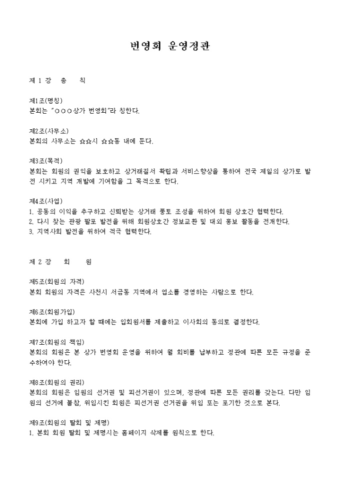 9,000원/월총 23개 조항으로 구성된 상가번영회 운영정관 양식입니다. 회칙으로도 이용하시면 됩니다.