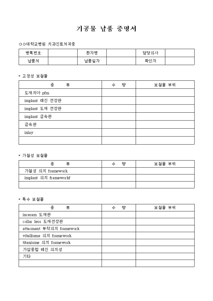 기공물 납품 증명서