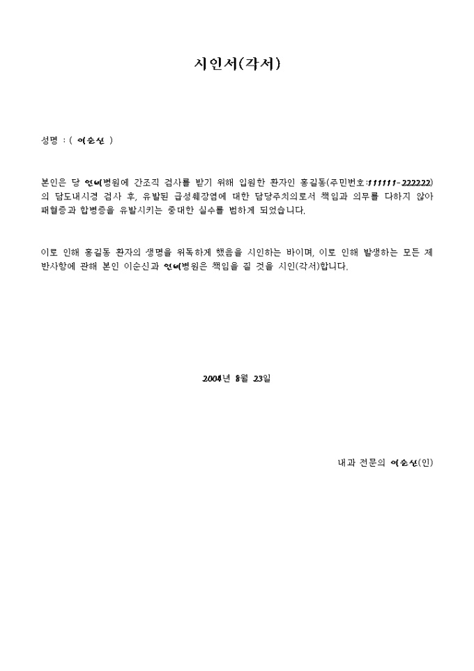 9,000원/월담당 주치의의 부주의로 인한 부분에 대하여 이로 인해 발생하는 모든제반사항애 대해 책임을 진다는 내용의 시인서입니다.