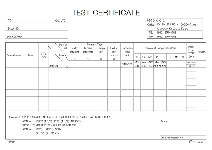 영문 TEST CERTIFICATE 양식입니다.