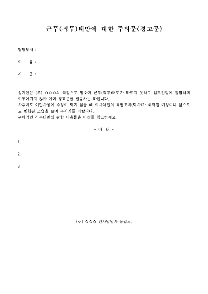 9,000원/월회사직원의 업무태만에 대해 회사에서 발송하는 주의문 양식입니다.