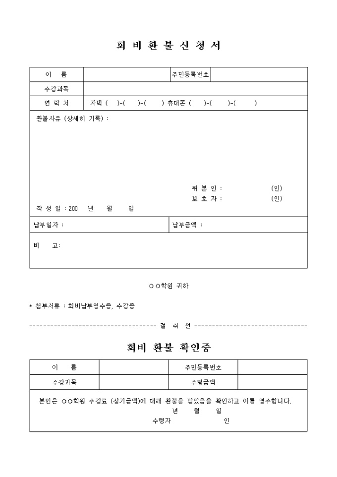 9,000원/월학원등에 회비 환불을 요청할때 사용할 수 있도록 만든