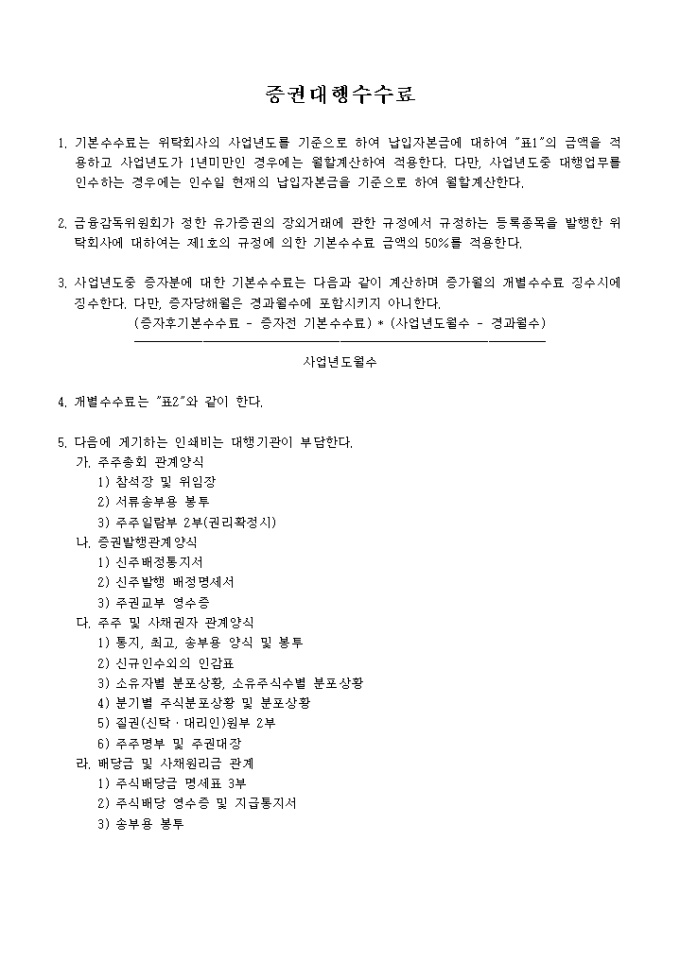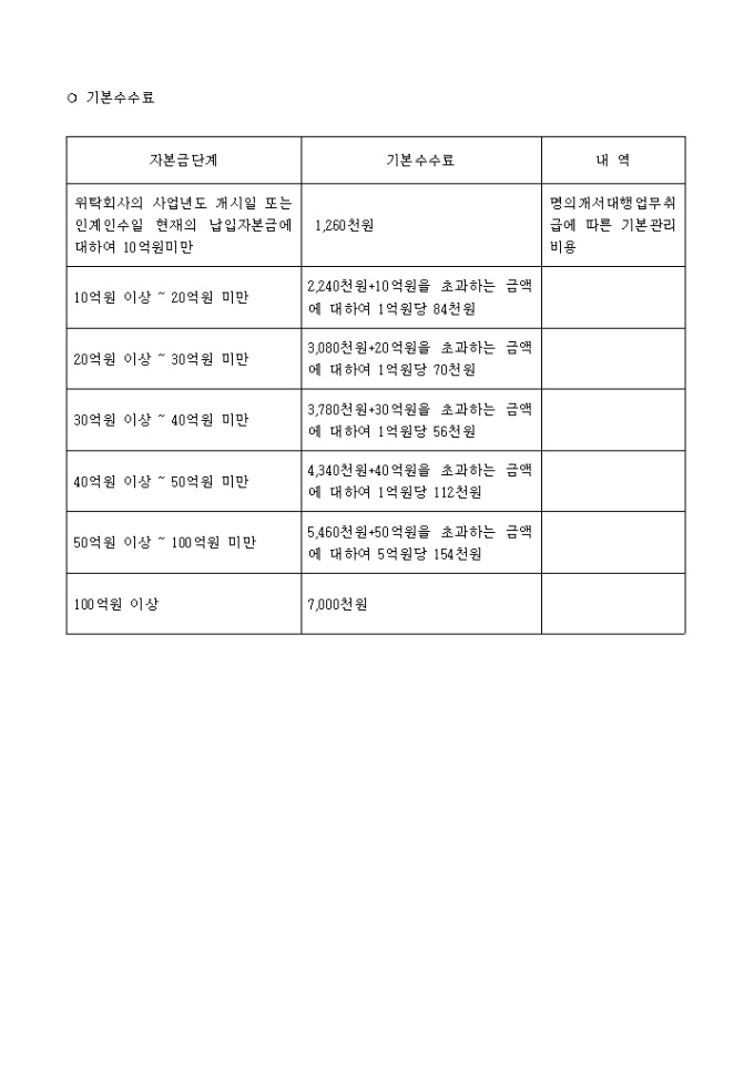 1. 기본수수료는 위탁회사의 사업년도를 기준으로 하여 납입자본금에 대하여 "표1"의 금액을 적용하고 사업년도가 1년미만인 경우에는 월할계산하여 적용한다. 다만, 사업년도중 대행업무를 인수하는 경우에는 인수일 현재의 납입자본금을 기준으로 하여 월할계산한다.