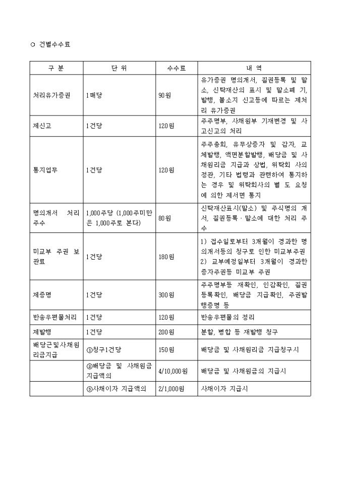 2. 금융감독위원회가 정한 유가증권의 장외거래에 관한 규정에서 규정하는 등록종목을 발행한 위탁회사에 대하여는 제1호의 규정에 의한 기본수수료 금액의 50%를 적용한다.