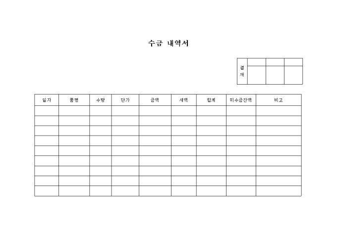 수금 내역을 기록하는 서식으로 일자,품명,수량,단가,금액,세액,합계,미수금액,비고란으로 되어 있습니다.