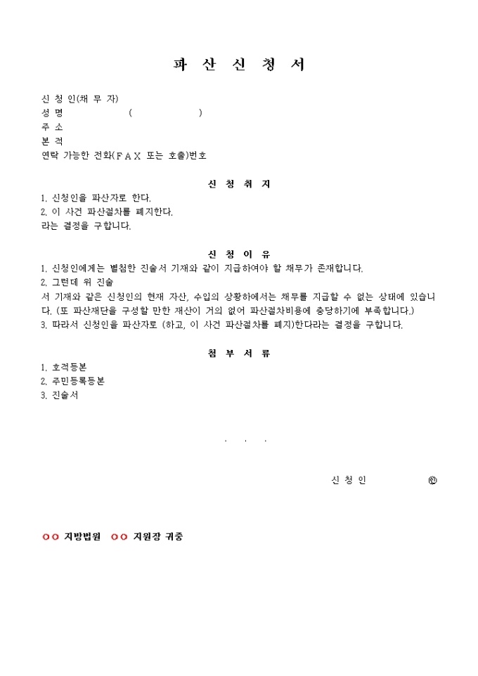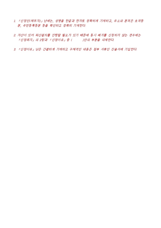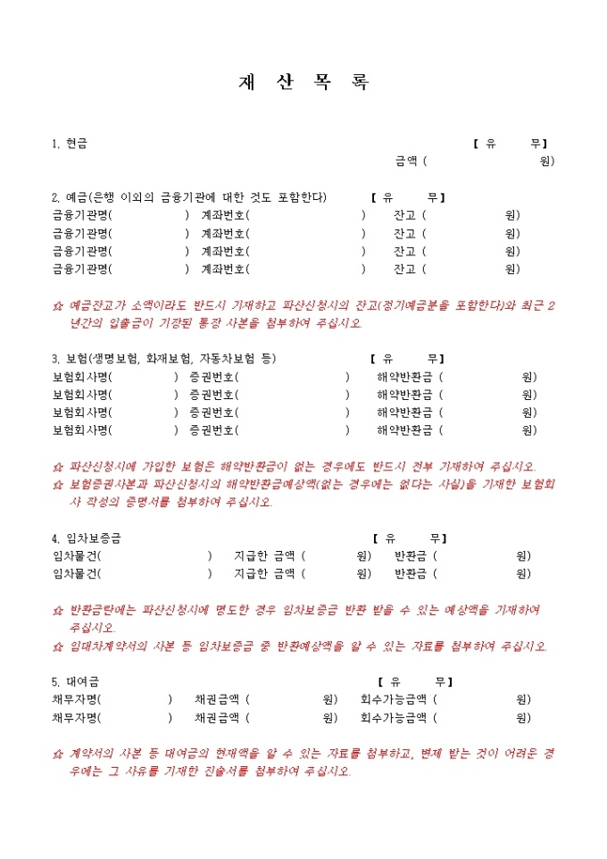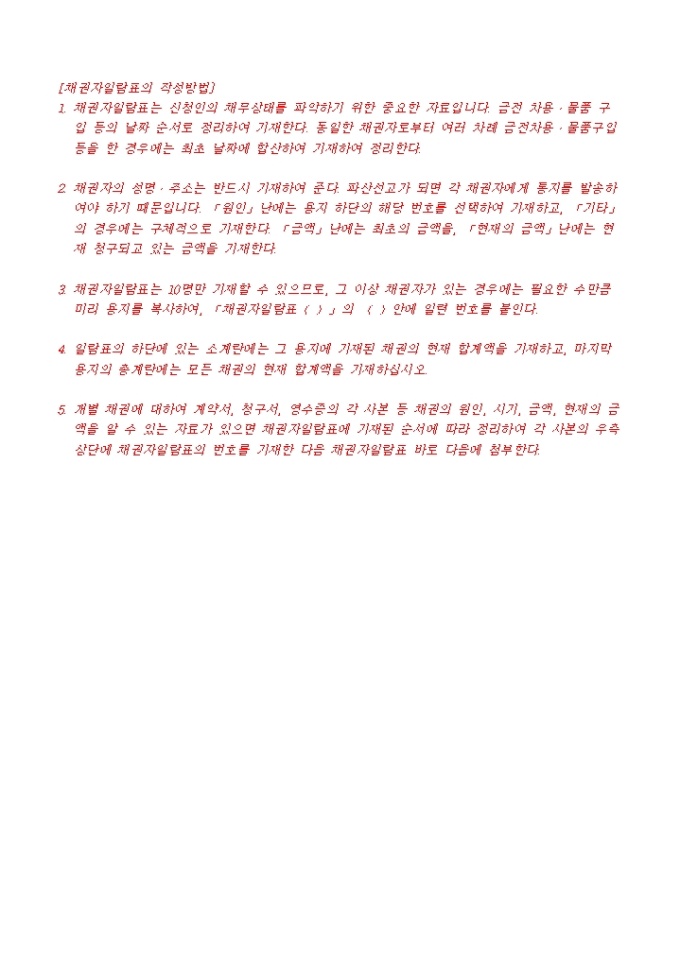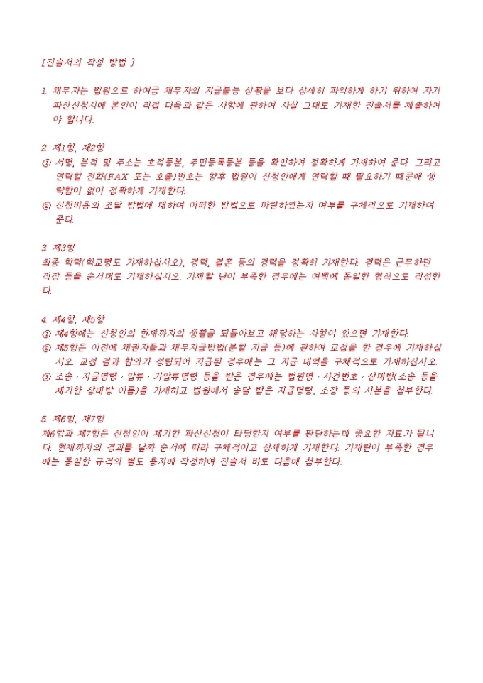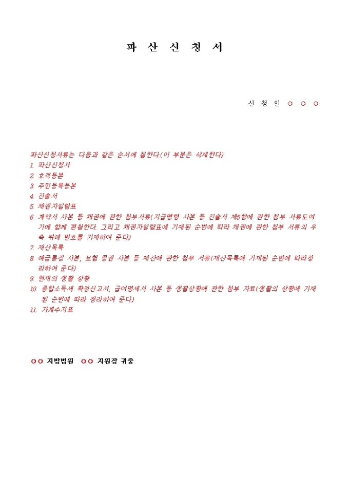 9,000원/월파산신청서, 진술서, 채권자일람표, 재산목록, 현재의 생활사항황, 가계수지표등으로 구성된 파산신청서식입니다. 각기 작성방법도 기재되어 있습니다.
