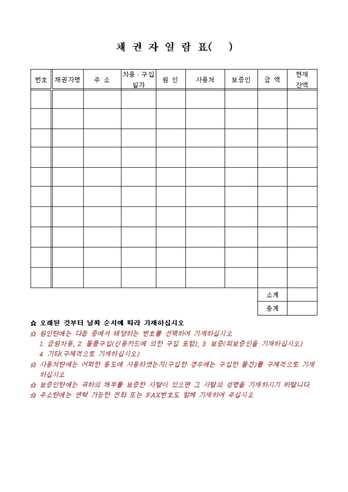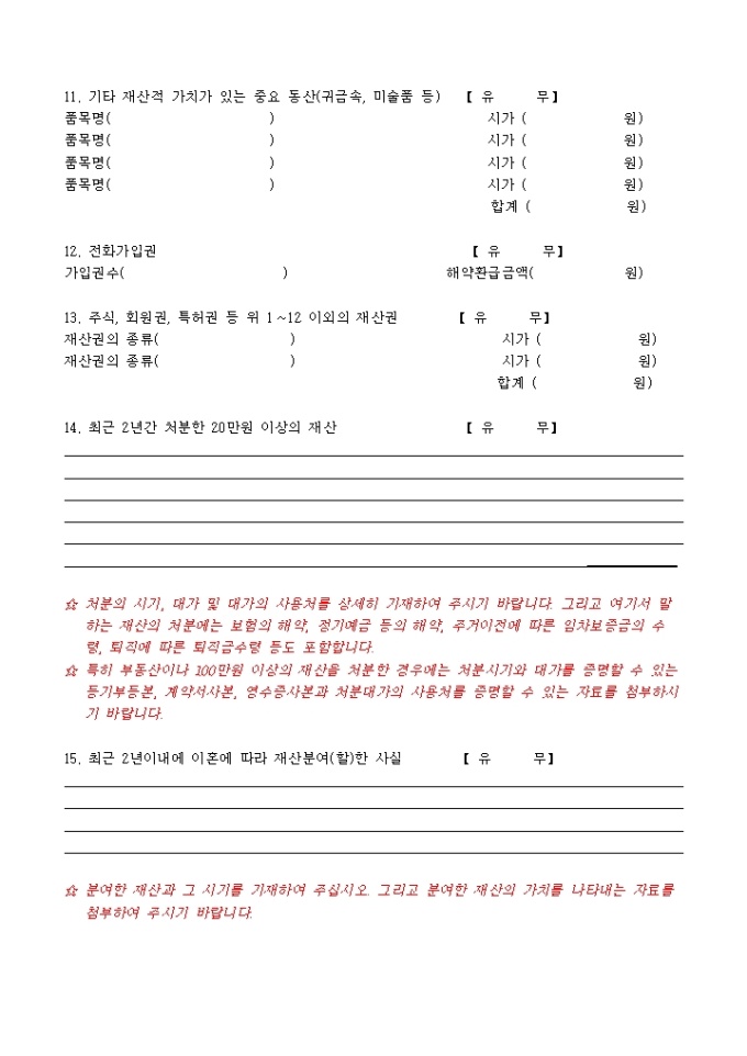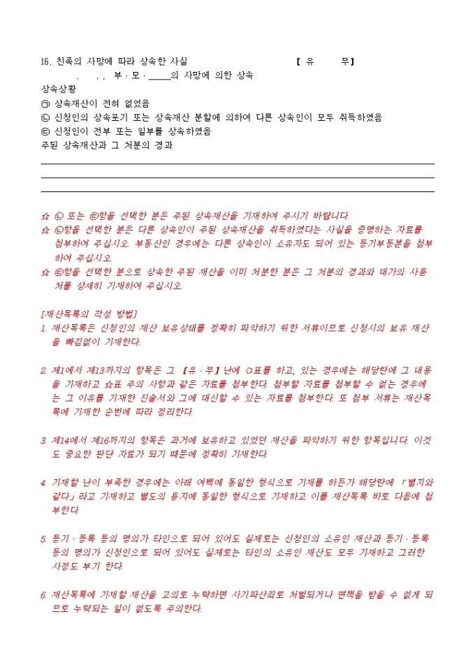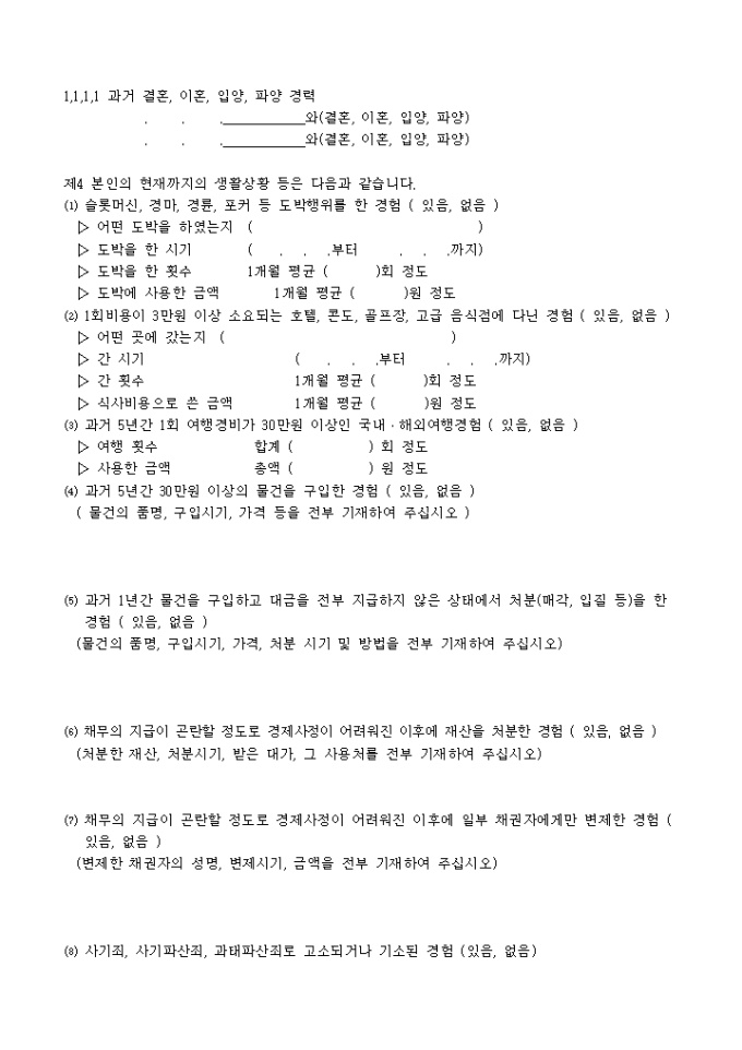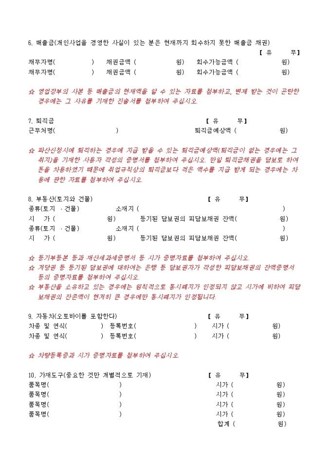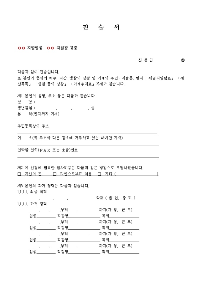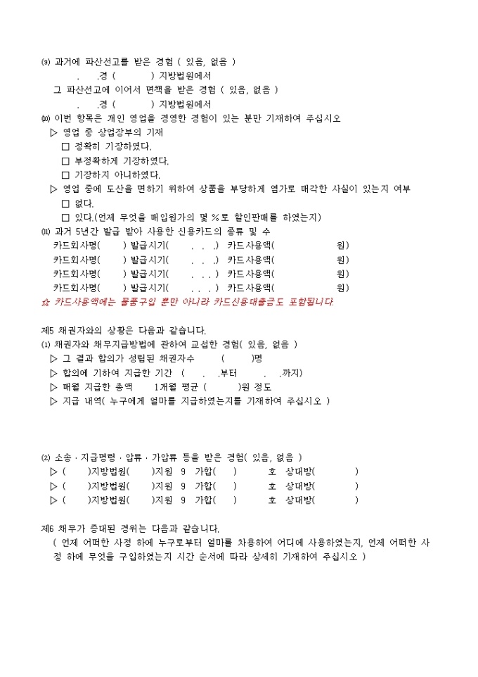 9,000원/월파산신청서, 진술서, 채권자일람표, 재산목록, 현재의 생활사항황, 가계수지표등으로 구성된 파산신청서식입니다. 각기 작성방법도 기재되어 있습니다.