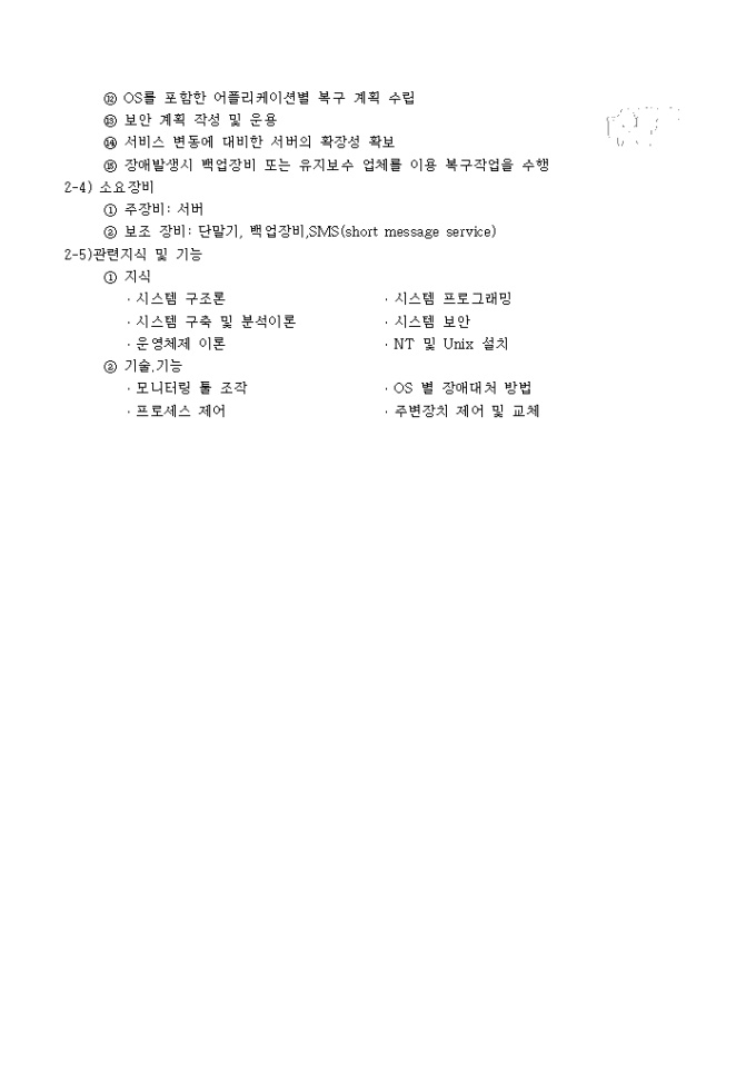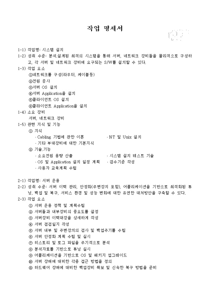 9,000원/월시스템 설치 작업과 서버 운용작업의 상세 명세서이며 작업명,성취 수준,작업 요소,소요 장비,관련 지식 및 기능이 기재되어 있습니다.