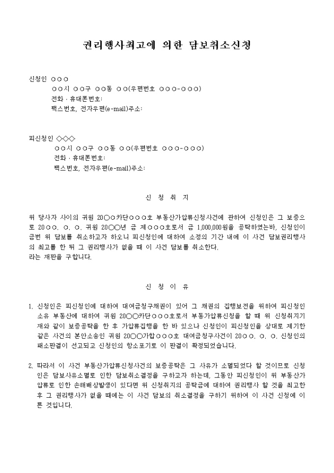 9,000원/월권리행사최고에 의한 담보취소 신청시 사용하는 서식입니다.