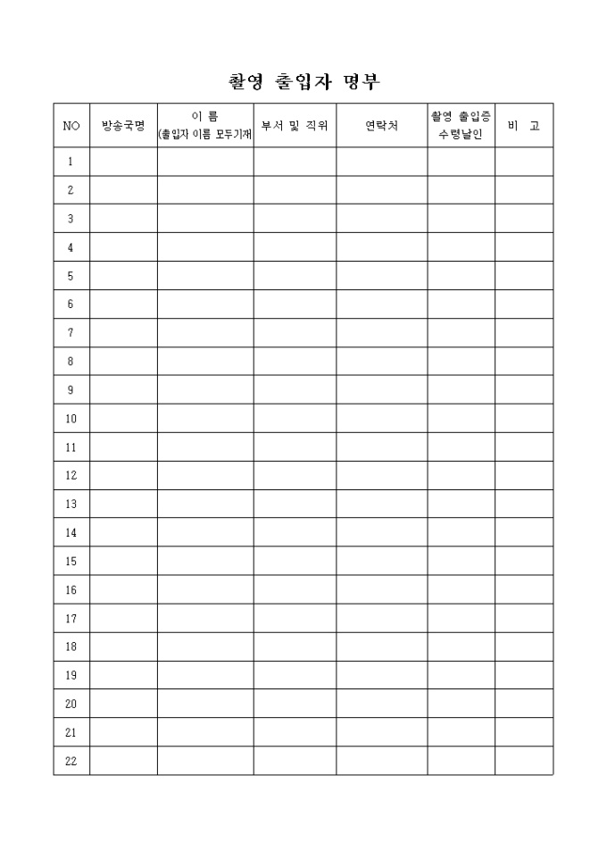 9,000원/월공연장이나 행사장에 출입하는 촬영팀에게 출입증발급시 간단하게 기재하는 목록표입니다.