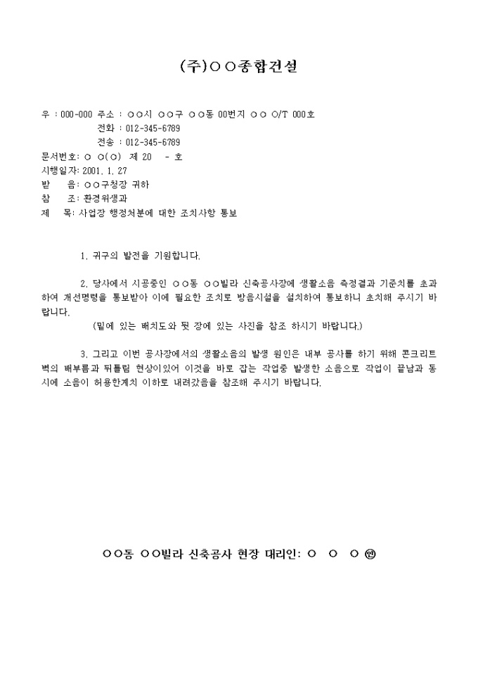 2. 당사에서 시공중인 동 빌라 신축공사장에 생활소음 측정결과 기준치를 초과하여 개선명령을 통보받아 이에 필요한 조치로 방음시설을 설치하여 통보하니 초치해 주시기 바랍니다......